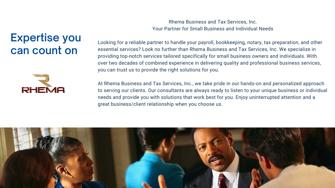 Rhema Business and Tax Services offers many helpful documents to different tax needs. Click here to view Tax Preparation Checklist and here for the Rhema Acceptance Agent Agreement.