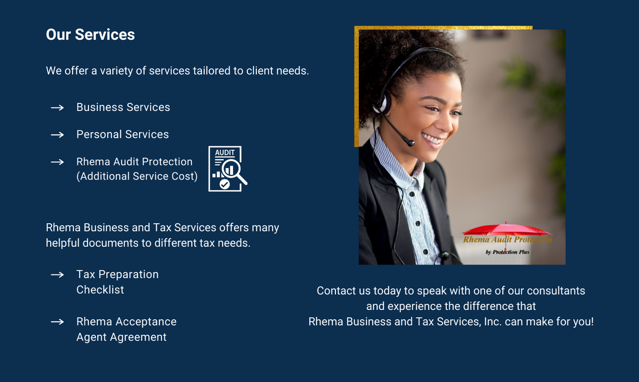 Rhema Business and Tax Services offers many helpful documents to different tax needs. Click here to view Tax Preparation Checklist and here for the Rhema Acceptance Agent Agreement.
